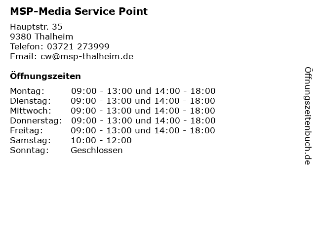 | Öffnungszeiten MSP-Media Service Point in Thalheim anzeigen | |