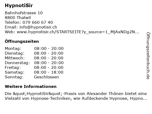 | Öffnungszeiten HypnotiSir in Thalwil anzeigen | |