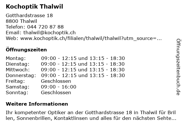 | Öffnungszeiten Kochoptik Thalwil in Thalwil anzeigen | |