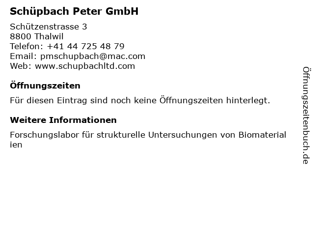 | Öffnungszeiten Schüpbach Peter GmbH in Thalwil anzeigen | |