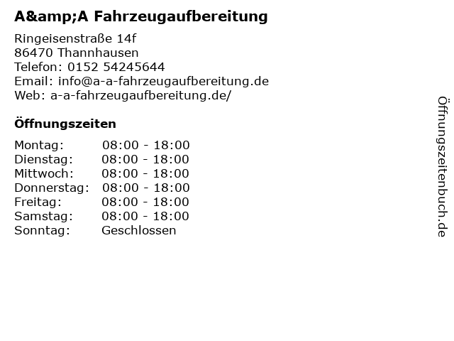 | Öffnungszeiten A&A Fahrzeugaufbereitung in Thannhausen anzeigen | |