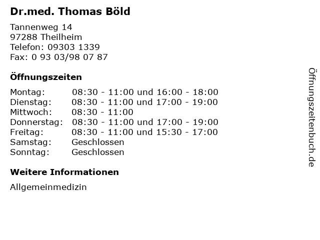 | Öffnungszeiten Dr.med. Thomas Böld in Theilheim anzeigen | |