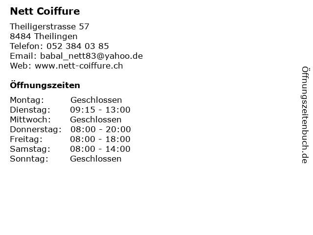 | Öffnungszeiten Nett Coiffure in Theilingen anzeigen | |