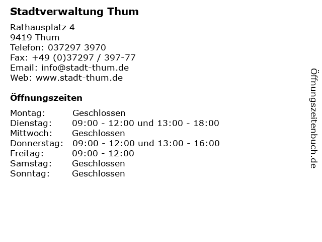 | Öffnungszeiten Stadtverwaltung Thum in Thum anzeigen | |
