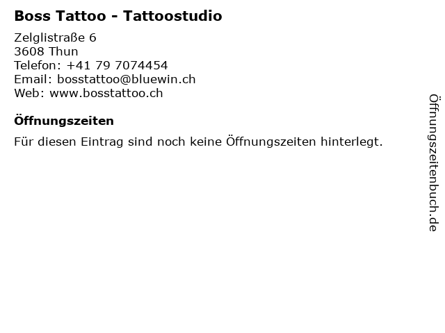 | Öffnungszeiten Boss Tattoo - Tattoostudio in Thun anzeigen | |