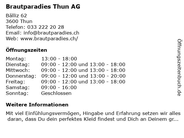 | Öffnungszeiten Brautparadies Thun AG in Thun anzeigen | |