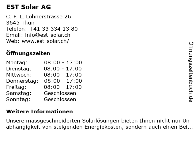 | Öffnungszeiten EST Solar AG in Thun anzeigen | |