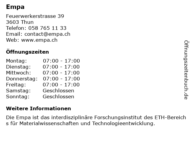 | Öffnungszeiten Empa in Thun anzeigen | |