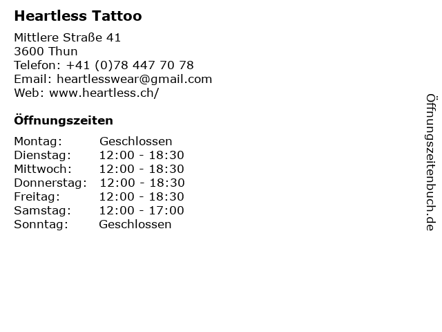 | Öffnungszeiten Heartless Tattoo in Thun anzeigen | |