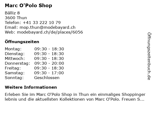 | Öffnungszeiten Marc O'Polo Shop in Thun anzeigen | |