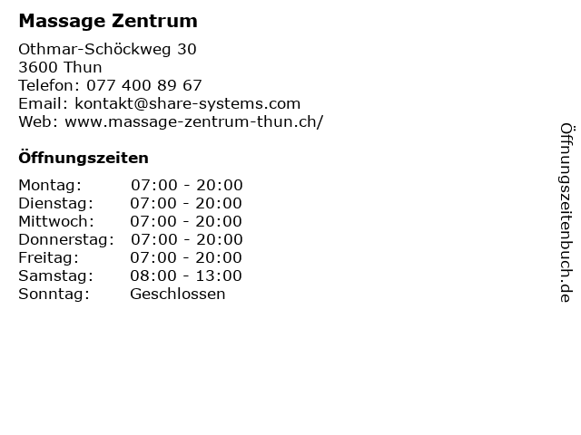| Öffnungszeiten Massage Zentrum in Thun anzeigen | |