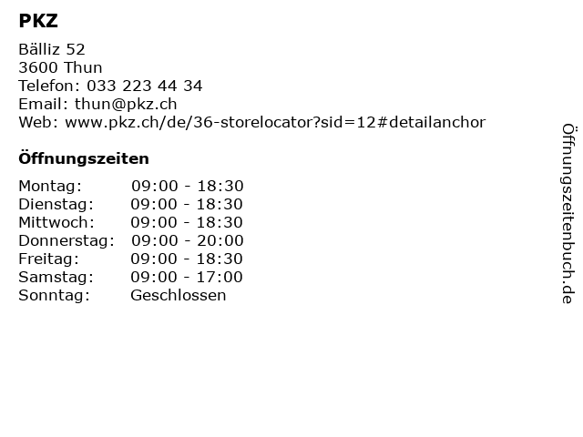 | Öffnungszeiten PKZ in Thun anzeigen | |