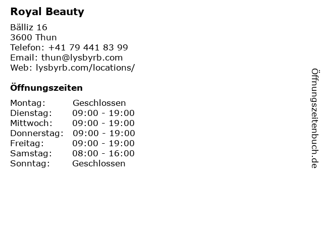 | Öffnungszeiten Royal Beauty in Thun anzeigen | |