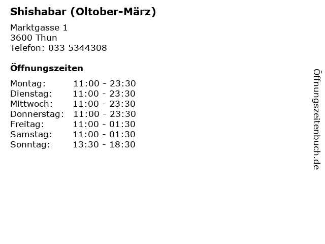 | Öffnungszeiten Shishabar (Oltober-März) in Thun anzeigen | |