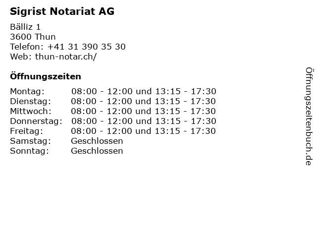 | Öffnungszeiten Sigrist Notariat AG in Thun anzeigen | |