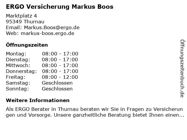 | Öffnungszeiten ERGO Versicherung Markus Boos in Thurnau anzeigen | |