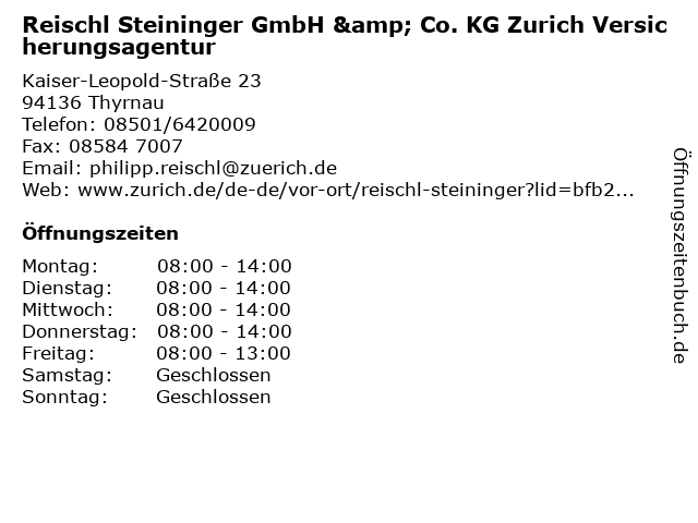 Branchen & Suchbegriffe zu Reischl Steininger GmbH & Co. KG Zurich Versicherungsagentur:agentur, reischl, steininger, versicherung, versicherungsagentur, versicherungsvertreter, zurich |