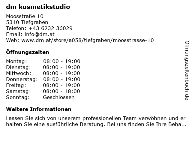 | Öffnungszeiten dm kosmetikstudio in Tiefgraben anzeigen | |