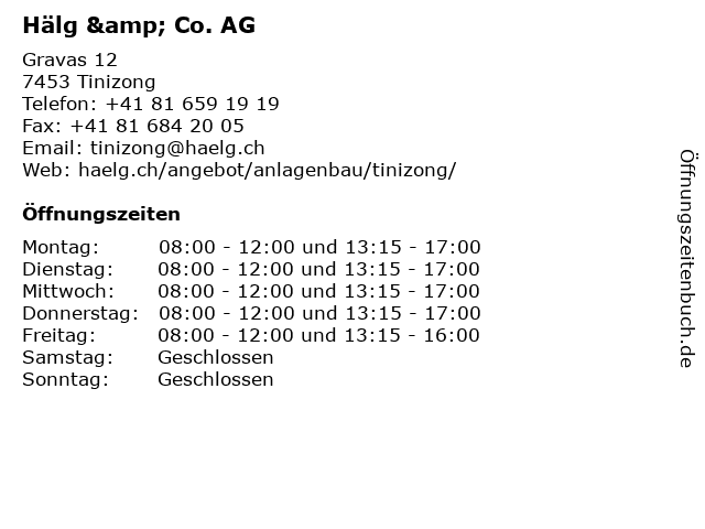 | Öffnungszeiten Hälg & Co. AG in Tinizong anzeigen | |