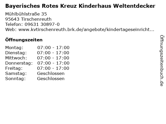 3 5 Haus Ziegelanger Bayerisches Rotes Kreuz Seniorenwohn- und Pflegeheim - Sekretariat (Entfernung: 1,39 km) Egerstraße 27, 95643 Tirschenreuth 6 Bayerisches Rotes Kreuz Waldkindergarten Waldentdecker (Entfernung: 2,90 km) Rothenbürger Straße 26, 95643 Tirschenreuth |