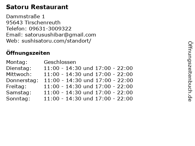 | Öffnungszeiten Satoru Restaurant in Tirschenreuth anzeigen | |