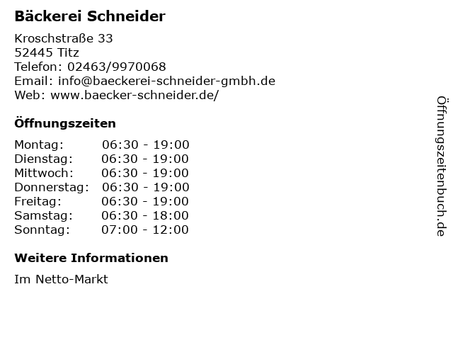 | Öffnungszeiten Bäckerei Schneider in Titz anzeigen | |