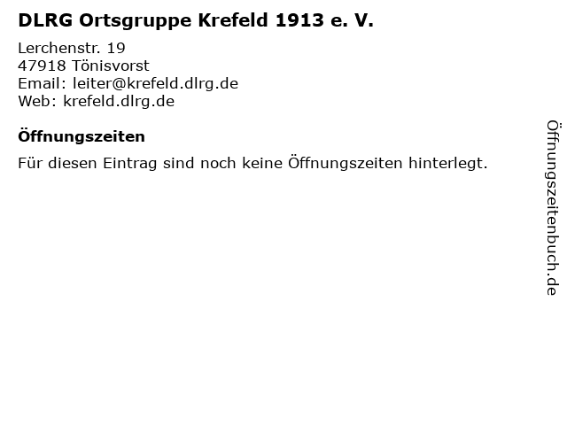 | Öffnungszeiten DLRG Ortsgruppe Krefeld 1913 e. V. in Tönisvorst anzeigen | |