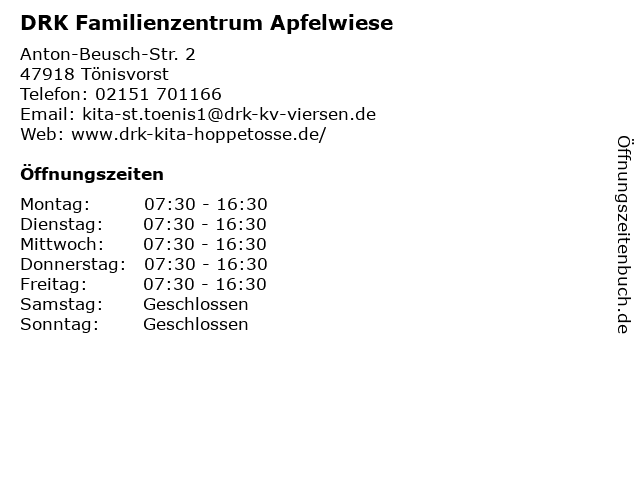 1 Deutsches Rotes Kreuz Familienzentrum Frajowaldi (Entfernung: 0,26 km) Rosental 10 B, 47918 Tönisvorst 4 Städtische Kindertageseinrichtung / Familienzentrum (Entfernung: 2,72 km) Am Kempschen Weg 51, 47804 Krefeld 6 Kindertagesstätte Kinder- und Familienzentrum MUMM-Kids (Entfernung: 5,01 km) Dreikönigenstr. 147-149, 47798 Krefeld |