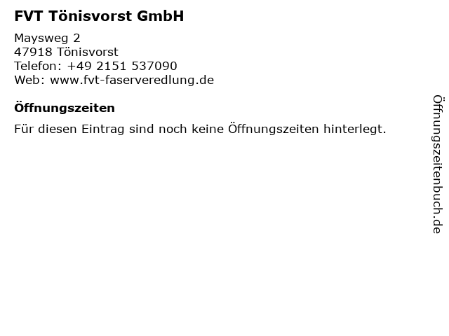 | Öffnungszeiten FVT Tönisvorst GmbH in Tönisvorst anzeigen | |
