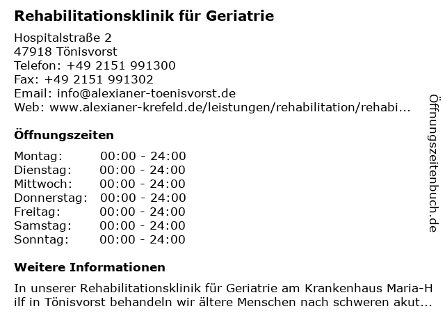 1 Rehabilitationsklinik Korschenbroich (Entfernung: 14,90 km) Sebastianusstraße 1, 41352 Korschenbroich 5 Netzwerk Altersmedizin - Krankenhaus Neuwerk (Entfernung: 10,99 km) Dünner Straße 214-216, 41066 Mönchengladbach 6 |