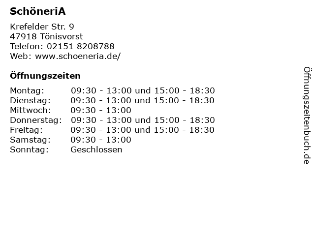 | Öffnungszeiten SchöneriA in Tönisvorst anzeigen | |