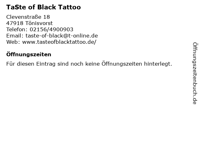 | Öffnungszeiten TaSte of Black Tattoo in Tönisvorst anzeigen | |