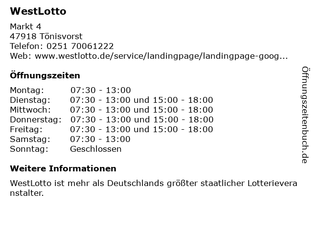 | Öffnungszeiten WestLotto in Tönisvorst anzeigen | |