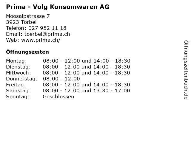 | Öffnungszeiten Prima - Volg Konsumwaren AG in Törbel anzeigen | |
