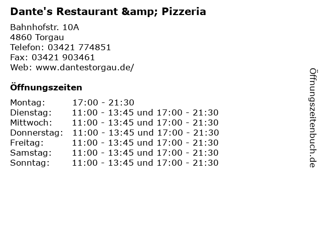 Öffnungszeiten Dante's Restaurant & Pizzeria