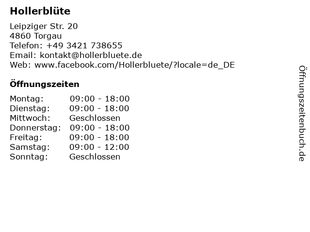 | Öffnungszeiten Hollerblüte in Torgau anzeigen | |