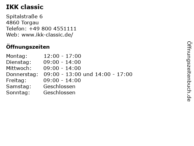 | Öffnungszeiten IKK classic in Torgau anzeigen | |