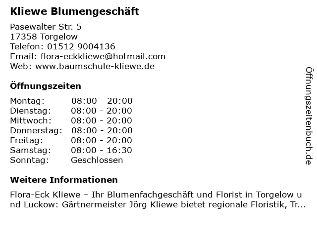 | Öffnungszeiten Kliewe Blumengeschäft in Torgelow anzeigen | |