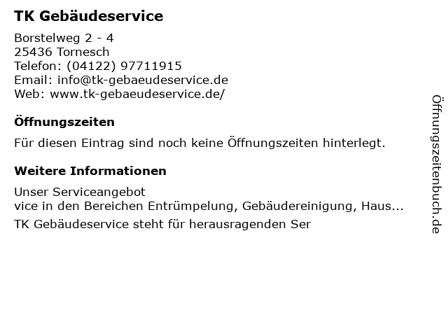 | Öffnungszeiten TK Gebäudeservice in Tornesch anzeigen | |