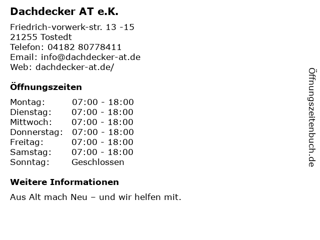 | Öffnungszeiten Dachdecker AT e.K. in Tostedt anzeigen | |