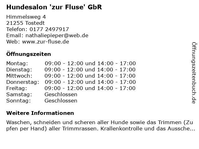 Öffnungszeiten Hundesalon 'zur Fluse' GbR in Tostedt anzeigen | |