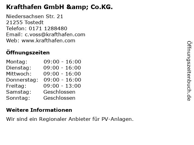 | Öffnungszeiten Krafthafen GmbH & Co.KG. in Tostedt anzeigen | |
