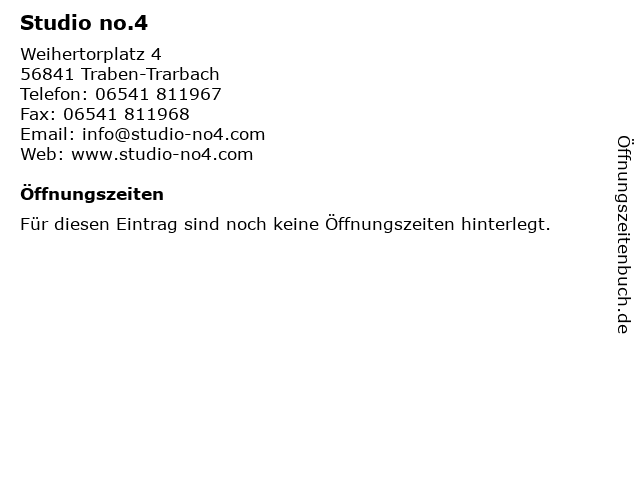 | Öffnungszeiten Studio no.4 in Traben-Trarbach anzeigen | |