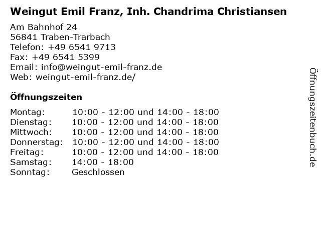 Branchen & Suchbegriffe zu Weingut Emil Franz, Inh. Chandrima Christiansen:chandrima, christiansen, emil, franz, liköre, schnäpse, weine, weingut, weinhandel |