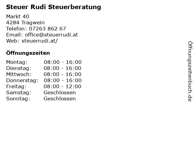 | Öffnungszeiten Steuer Rudi Steuerberatung in Tragwein anzeigen | |