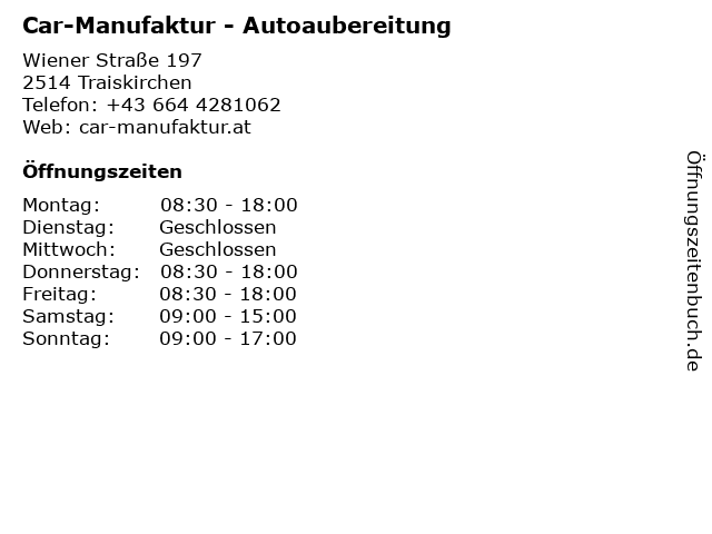 2 SAM US Car Service GmbH - KFZ Reparaturen, Tuning-US-Car (Entfernung: 1,37 km) Badener Straße 37, 2514 Traiskirchen 3 Lucky Car Franchise & Beteiligung GmbH (Entfernung: 5,84 km) Tattendorfergasse 5-15, 2500 Baden Bei Wien 5 Bosch Car Service - Autoludwig Reparatur- und Vertriebs GmbH (Entfernung: 12,32 km) Triester Straße 150, 1230 Wien 6 |