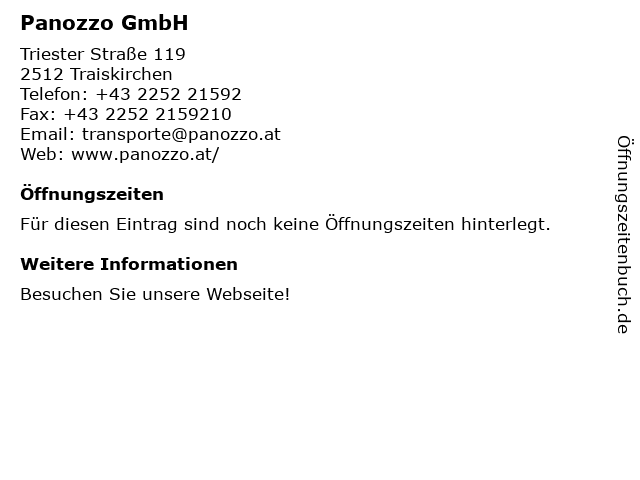 | Öffnungszeiten Panozzo GmbH in Traiskirchen anzeigen | |