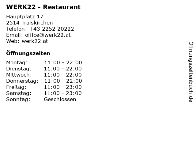 | Öffnungszeiten WERK22 - Restaurant in Traiskirchen anzeigen | |