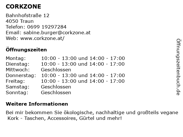 | Öffnungszeiten CORKZONE in Traun anzeigen | |