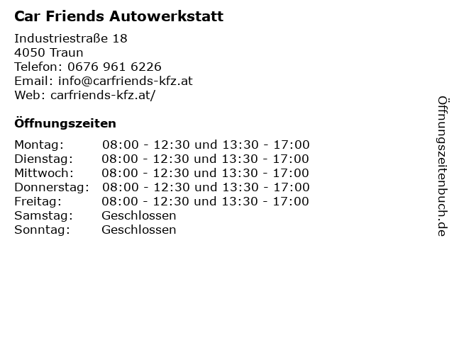 | Öffnungszeiten Car Friends Autowerkstatt in Traun anzeigen | |